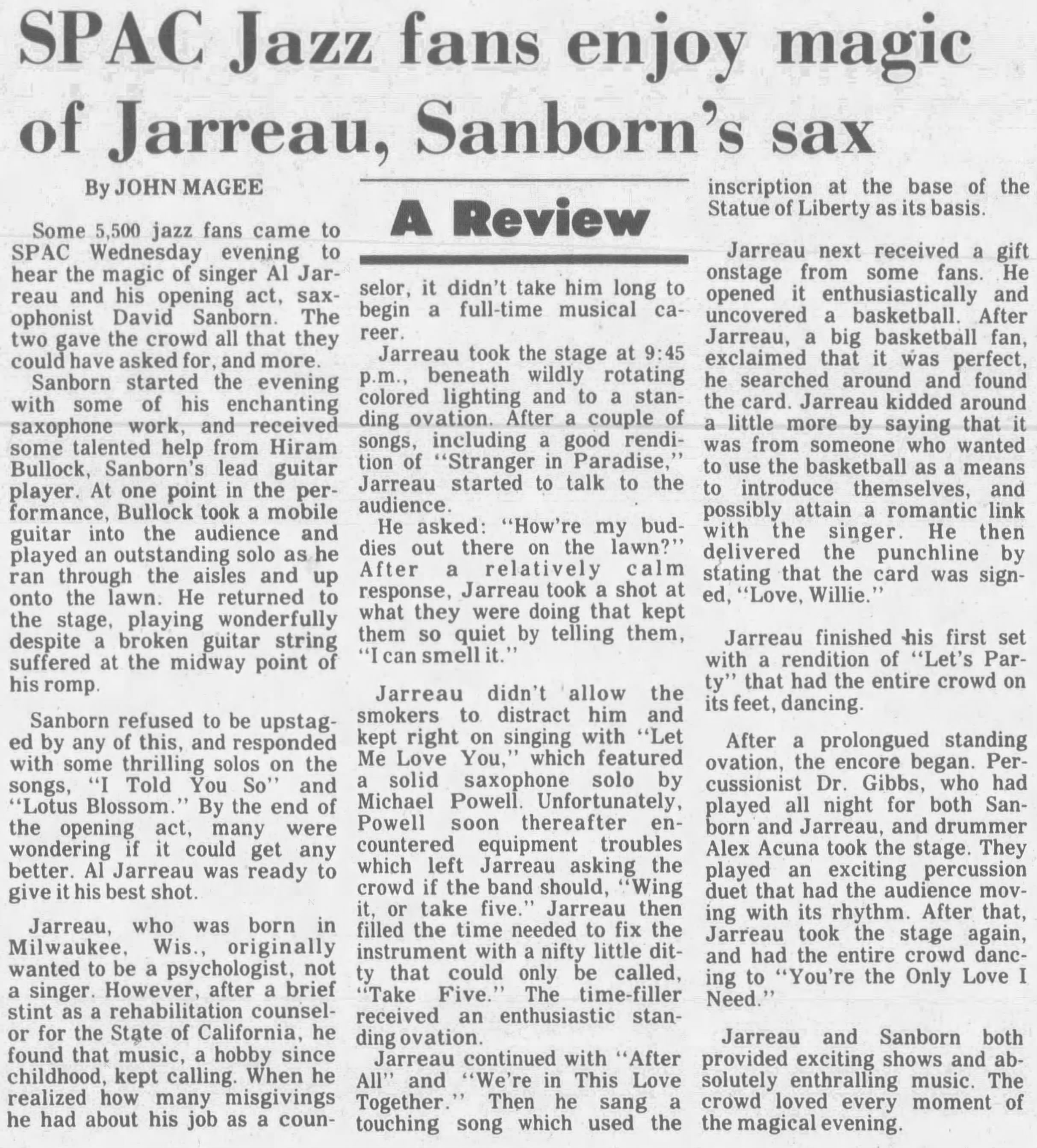 On July 24, 1985, about 5,500 jazz fans came to the Saratoga Performing Arts Center to hear singer Al Jarreau and his opening act, saxman David Sanborn.