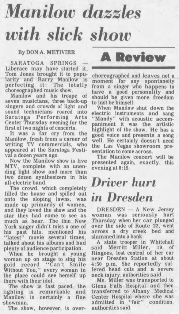 On July 25, 1985, Barry Manilow brought his highly choreographed show to the Saratoga Performing Arts Center.