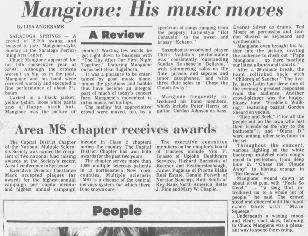 On July 28, 1985, Chuck Mangione and his flugelhorn played the Saratoga Performing Arts Center for the 14th consecutive year.
