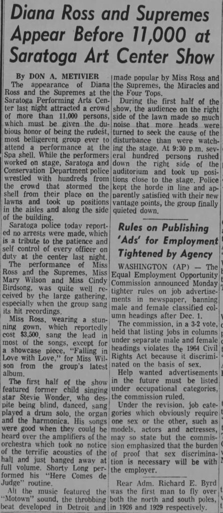 Diana Ross, Don A. Metivier, Glens Falls Times, Saratoga Performing Arts Center, Stevie Wonder, Supremes