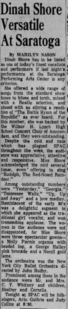 Dinah Shore, Marilyn Nason, Post-Star, Saratoga Performing Arts Center