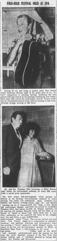 Heading the list of American folk entertainers Monday was Theodore Bikel, best known for his starring role opposite Mary Martin in “Sound of Music.” Other performers on the card were Ian and Sylvia, a pair of highly-talented young Canadians; Tom Paxton, singer, composer, and guitarist, who was making a “return” performance to the Spa, and the Paul Butterfield Blues Band, a folk- rock group.