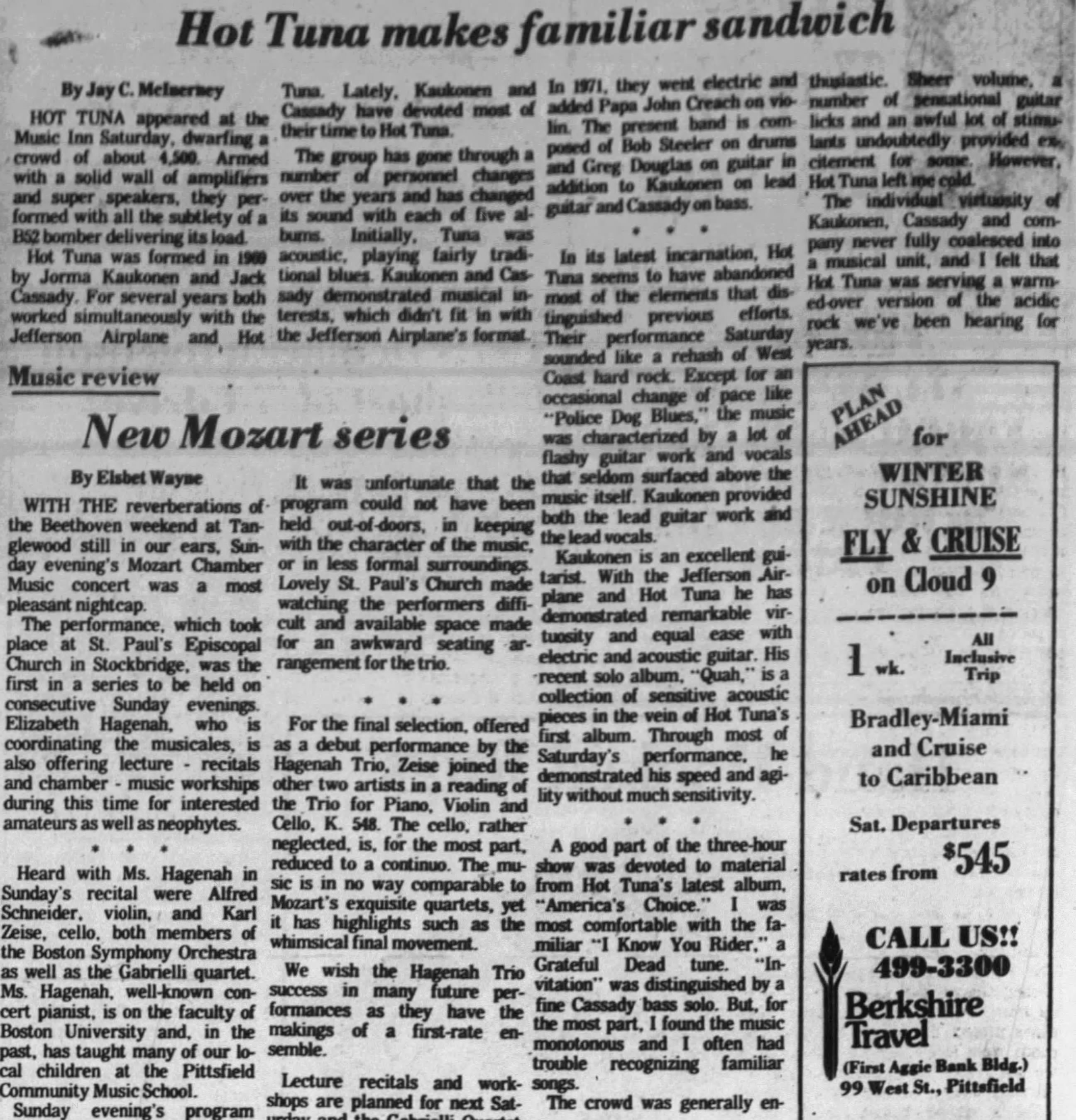 On July 26, 1975, the latest incarnation of Hot Tuna plugged in for a big Berkshires crowd at the Music Inn in Lenox.