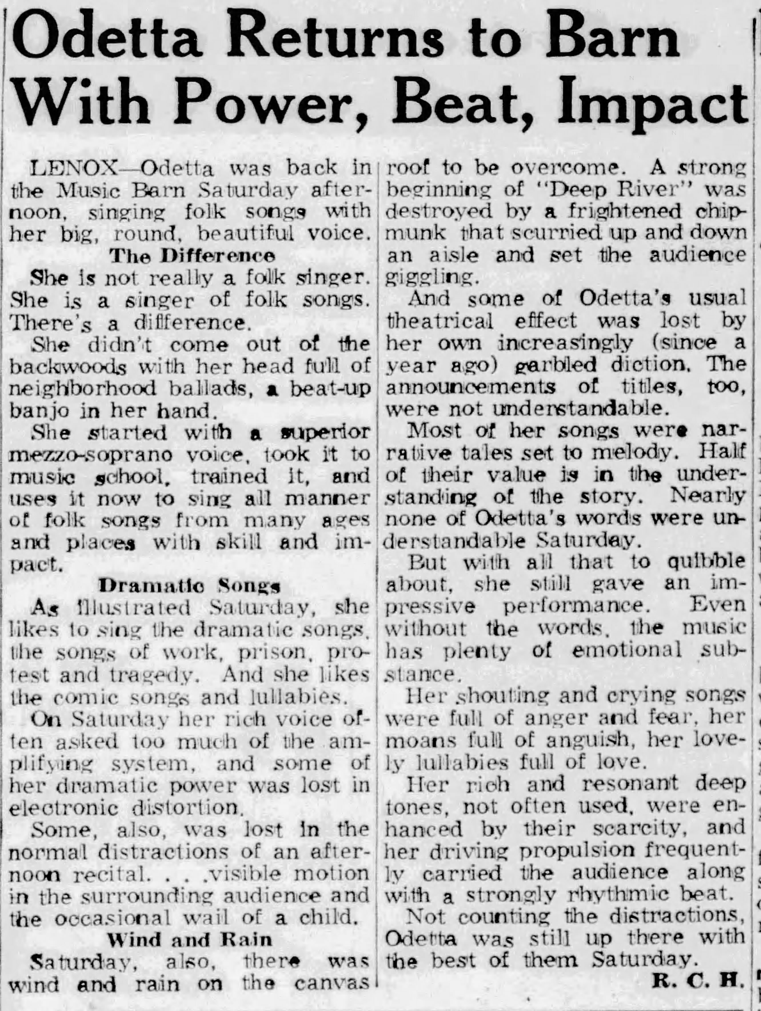 On July 17, 1965, the “Queen of American folk music” (per Martin Luther King, Jr.), Odetta, covered all the emotional bases and fought off nature’s challenges in a performance at the Berkshire Music Barn in Lenox.