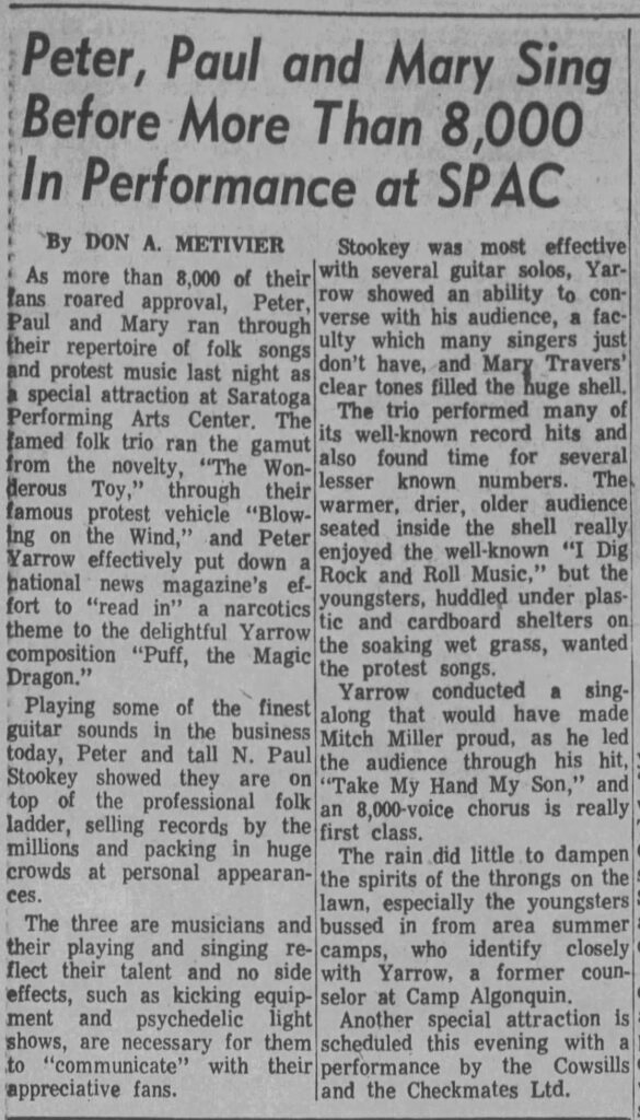 Don A. Metivier, Glens Falls Times, Peter Paul and Mary, Saratoga Performing Arts Center