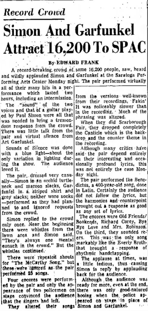 Edward Frank, Saratoga Performing Arts Center, Simon & Garfunkel, Troy Record